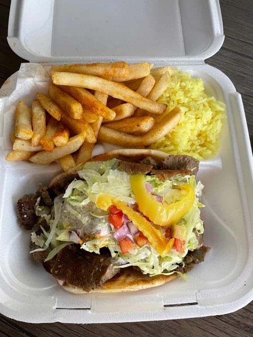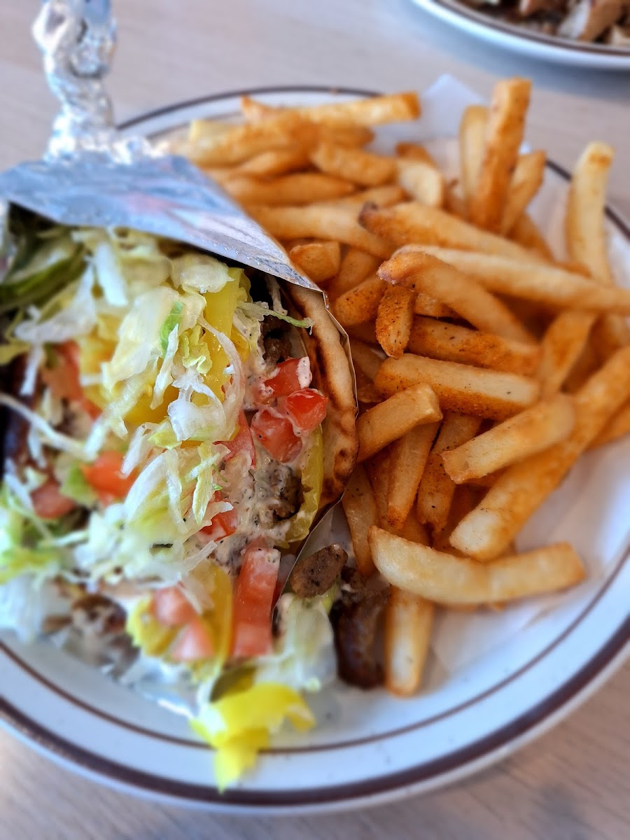 My Husband and I stopped for lunch today and was not disappointed. Gyro was absolutely AMAZING. It was fresh, flavorful and great portion size. I got the side salad and my husband got the fries and we shared each and they were both delicious as well. Not only was the food exceptional but the owner (Mo) and the staff was beyond friendly and welcoming. We were so impressed by our experience that we returned a few hours later and purchased a gift card to give as a gift. We will certainly be returning again soon. (Picture is: Combo #2 Gyro w/the side salad and drink)