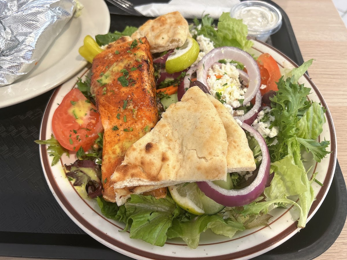 Ordered the gyros(large) and a side greek salad. A large portion of shaved meat - it was tasty as was the tzatziki sauce and veggies. My only complaint was that the sandwich pita was to small for the ingredients. Overall / I would definitely go back to this place. Salad was fresh, green and crunchy - with feta and a side portion of greek dressing.